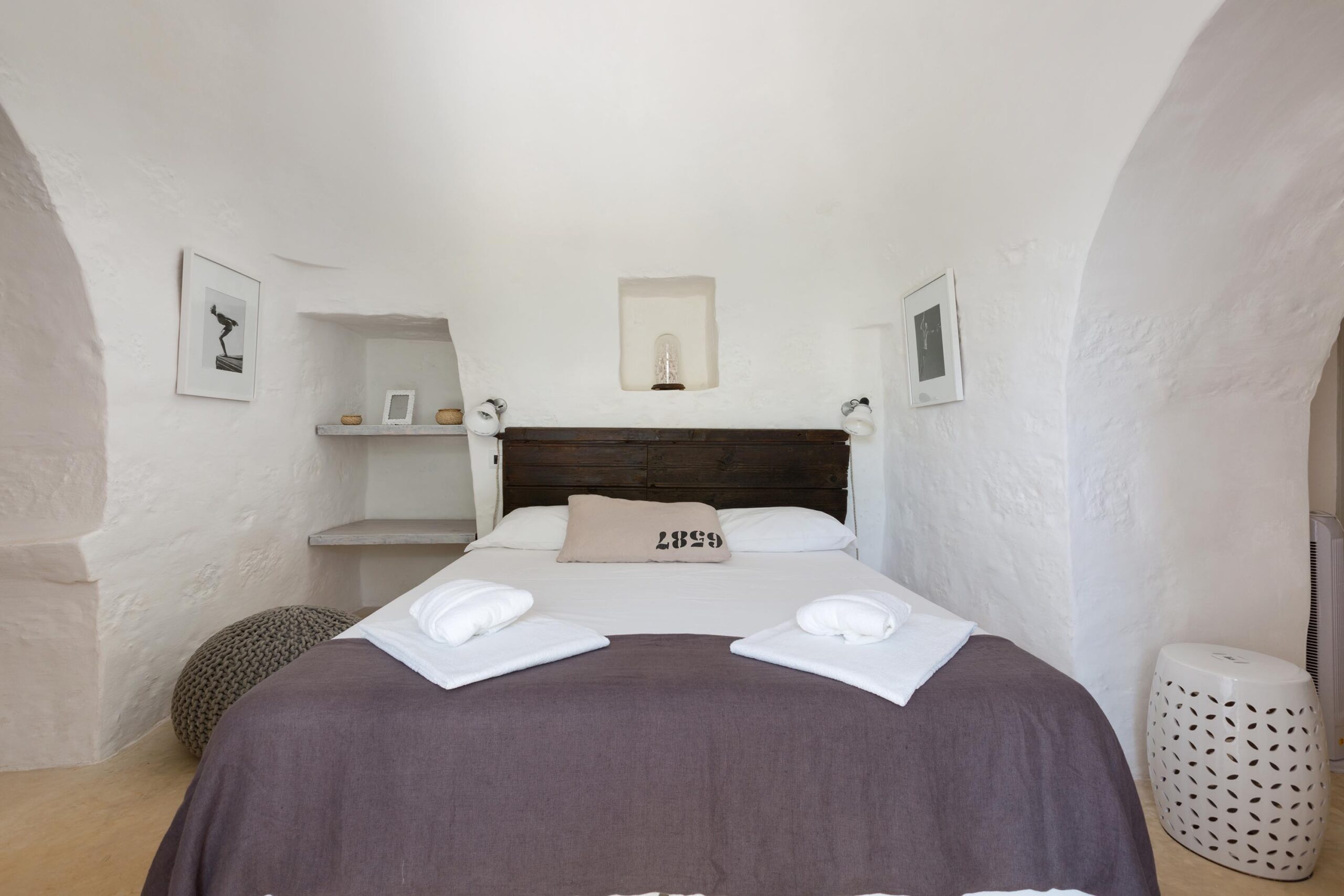 The internal layout of the 120-square-meter residence is organized across a primary unit composed of renovated lamie. The main living area is characterized by large windows overlooking the pool and leads into a kitchen equipped with an induction hob. An adjacent smaller living room, situated under a traditional alcove, contains a double sofa bed. The sleeping quarters comprise three double bedrooms, each featuring independent external access while remaining internally connected. One bedroom integrates original architectural elements, including milk-colored exposed stone and a fireplace frame, alongside a whirlpool tub carved directly into the rock. The property includes three en suite bathrooms with internal showers.