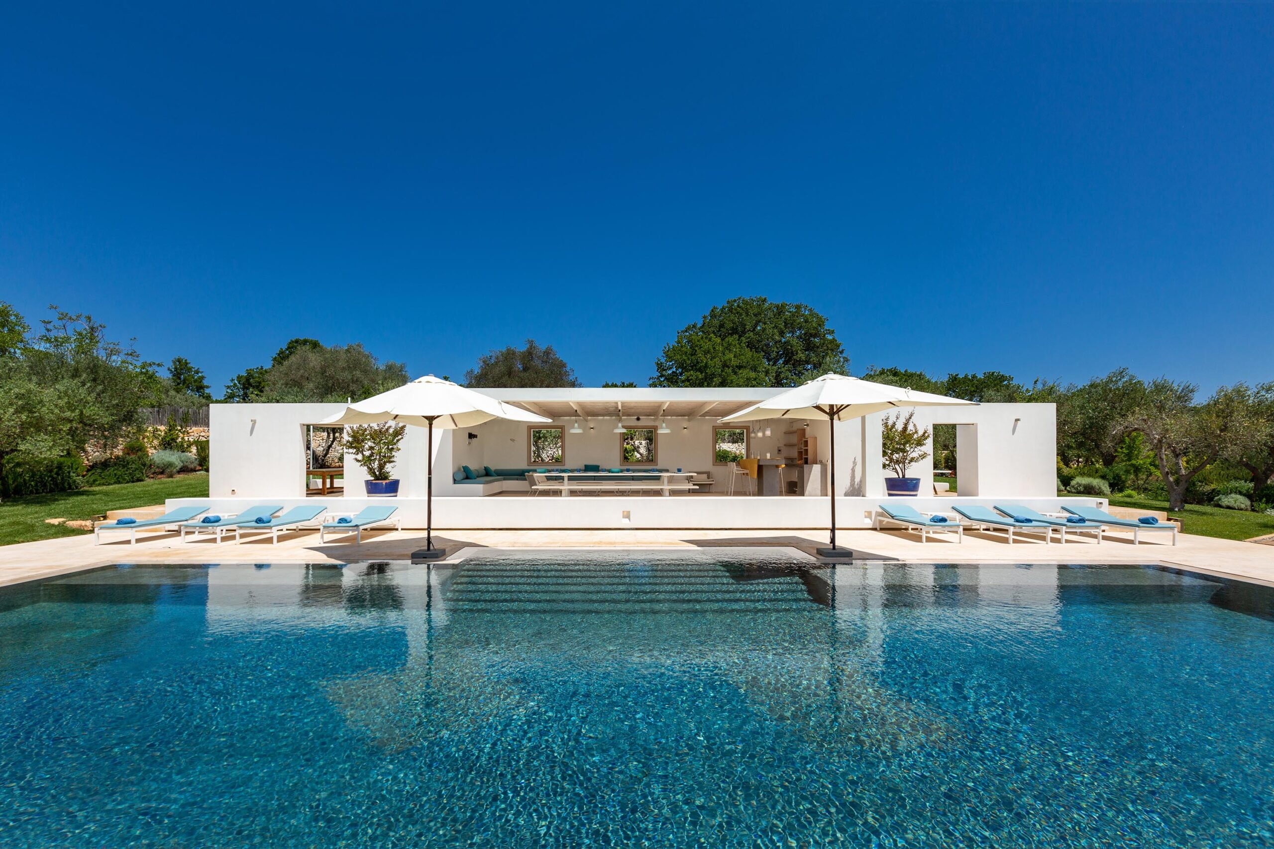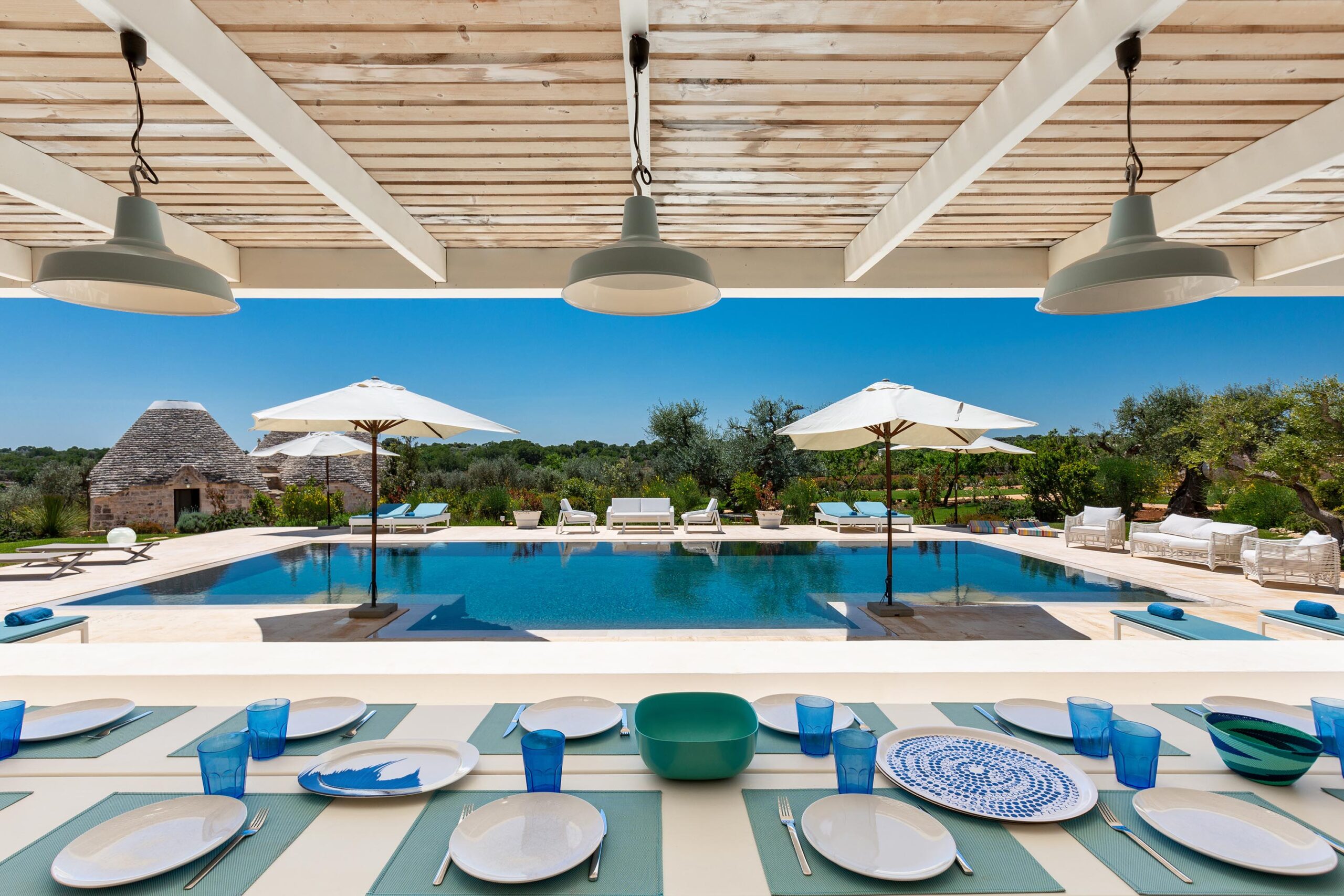 The 325-square-meter internal layout is divided between the main house and several independent annexes. The main dwelling features a bright living room with a dining area and a professional kitchen equipped with high-capacity appliances, including two dishwashers, an induction cooktop, a Teppanyaki griddle, and a deep fryer. This unit contains three double suites with king-size beds and en suite bathrooms. The surrounding trulli complex has been converted into four distinct guesthouses: the Pool trullo, Vigna trullo, Pergola trullo and Suite trullo. These annexes provide five additional double bedrooms, each featuring stone circular vaults and private bathrooms.