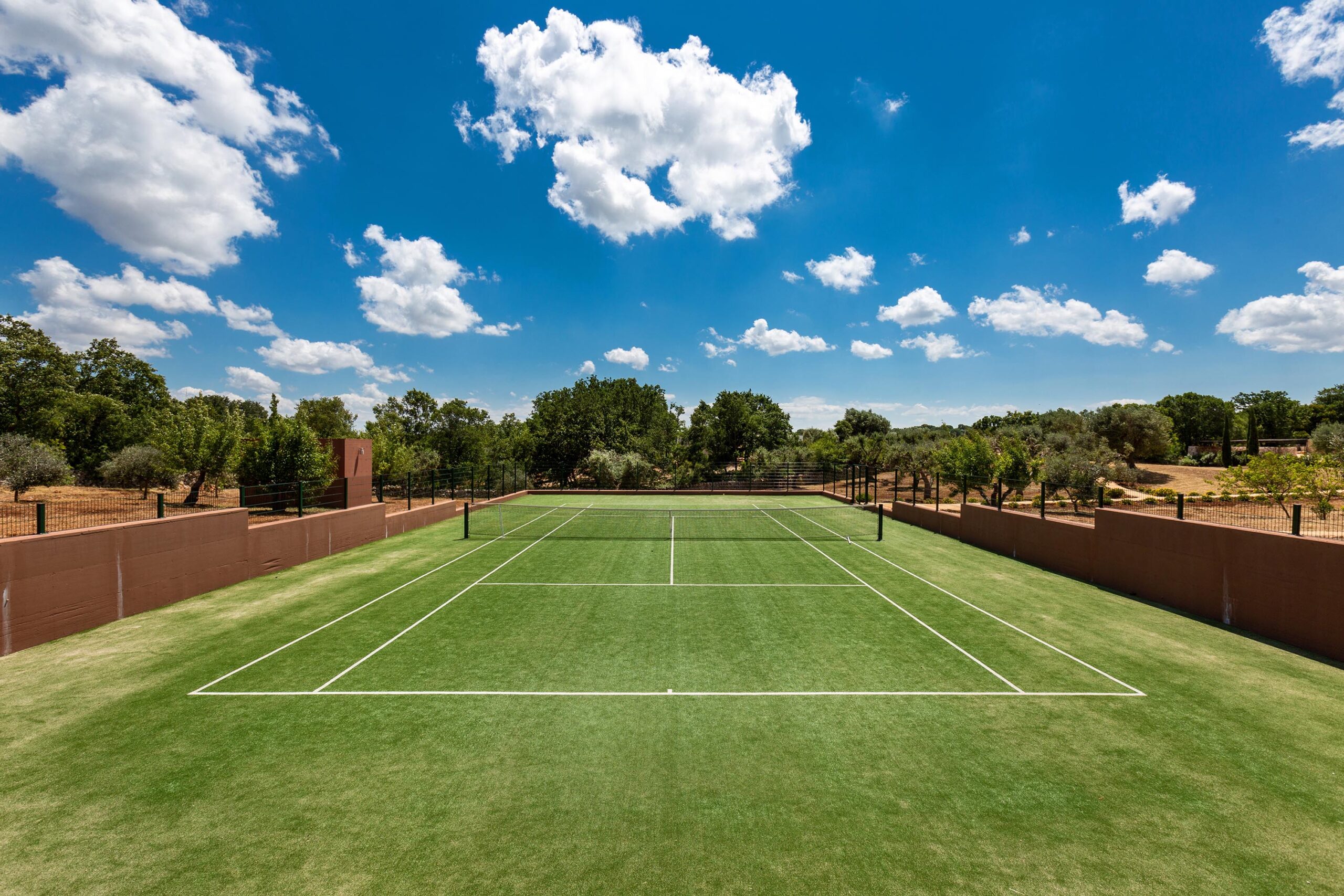 The outdoor spaces extend over six hectares of land, incorporating a 2,000-square-meter garden and a 144-cubic-meter swimming pool measuring 15×6 meters. The pool area is operational from May 1st to October 31st and is supported by a solarium, a modern veranda with lounge seating, and a dedicated bar area with an outdoor kitchen. Additional exterior features include a synthetic turf tennis court, a massage station, and a recreation zone with ping-pong and table soccer. A barbecue area is situated behind the main veranda for outdoor catering. The property is fully enclosed, offering secure parking for sixteen vehicles