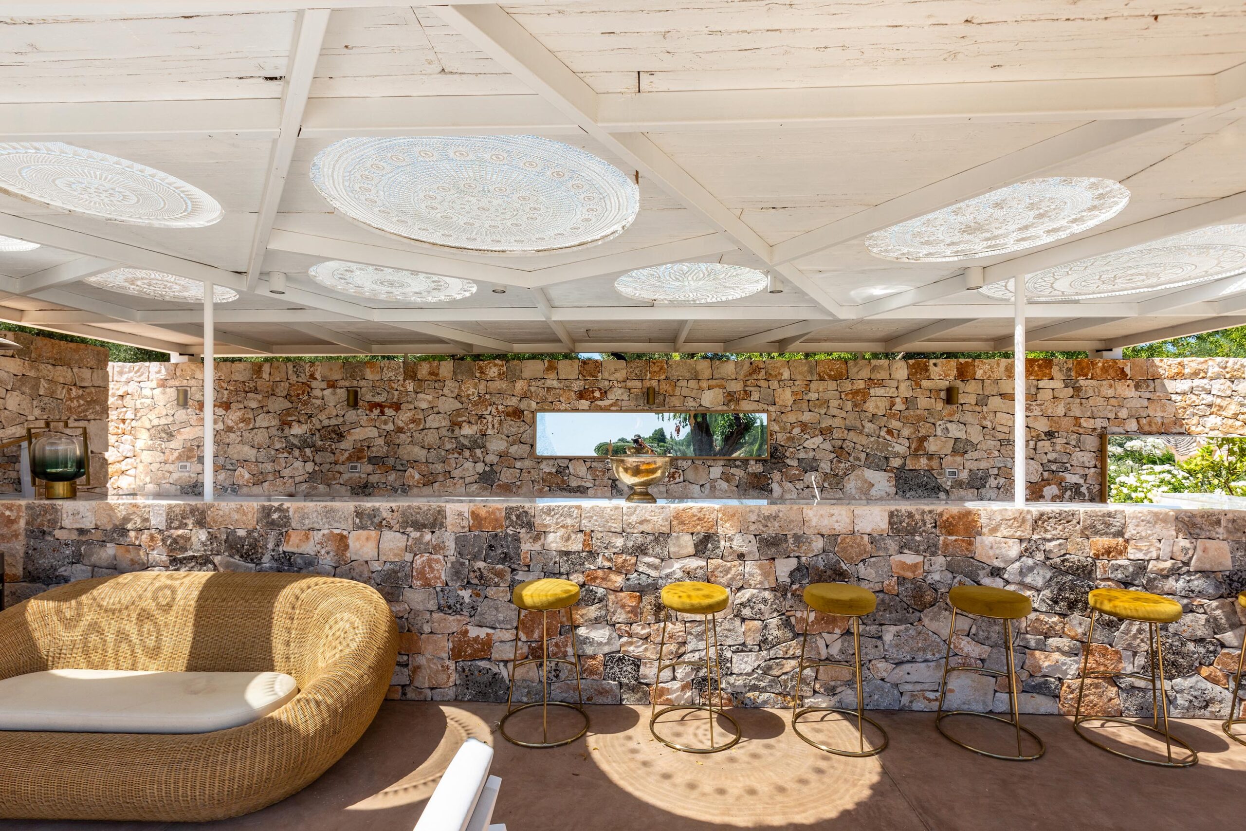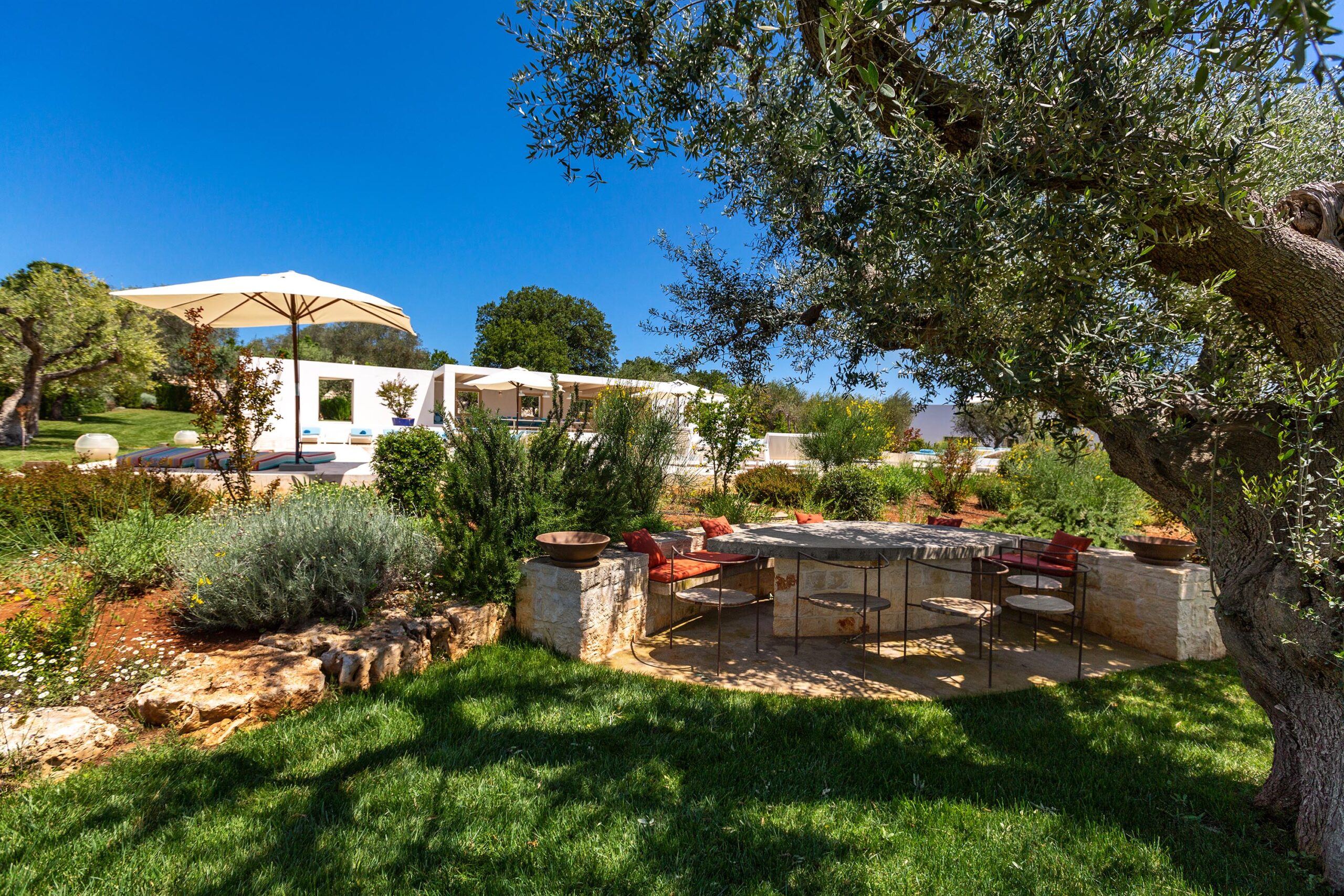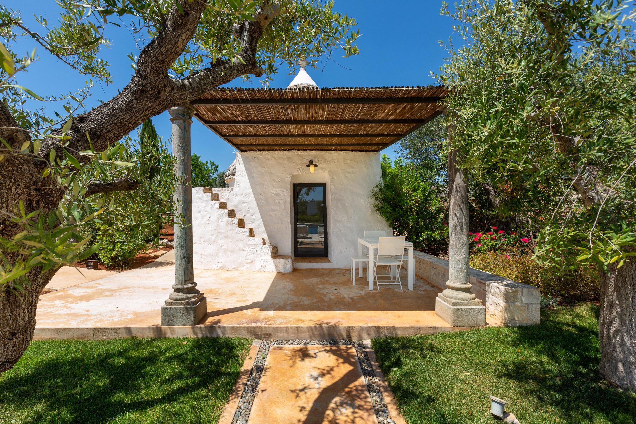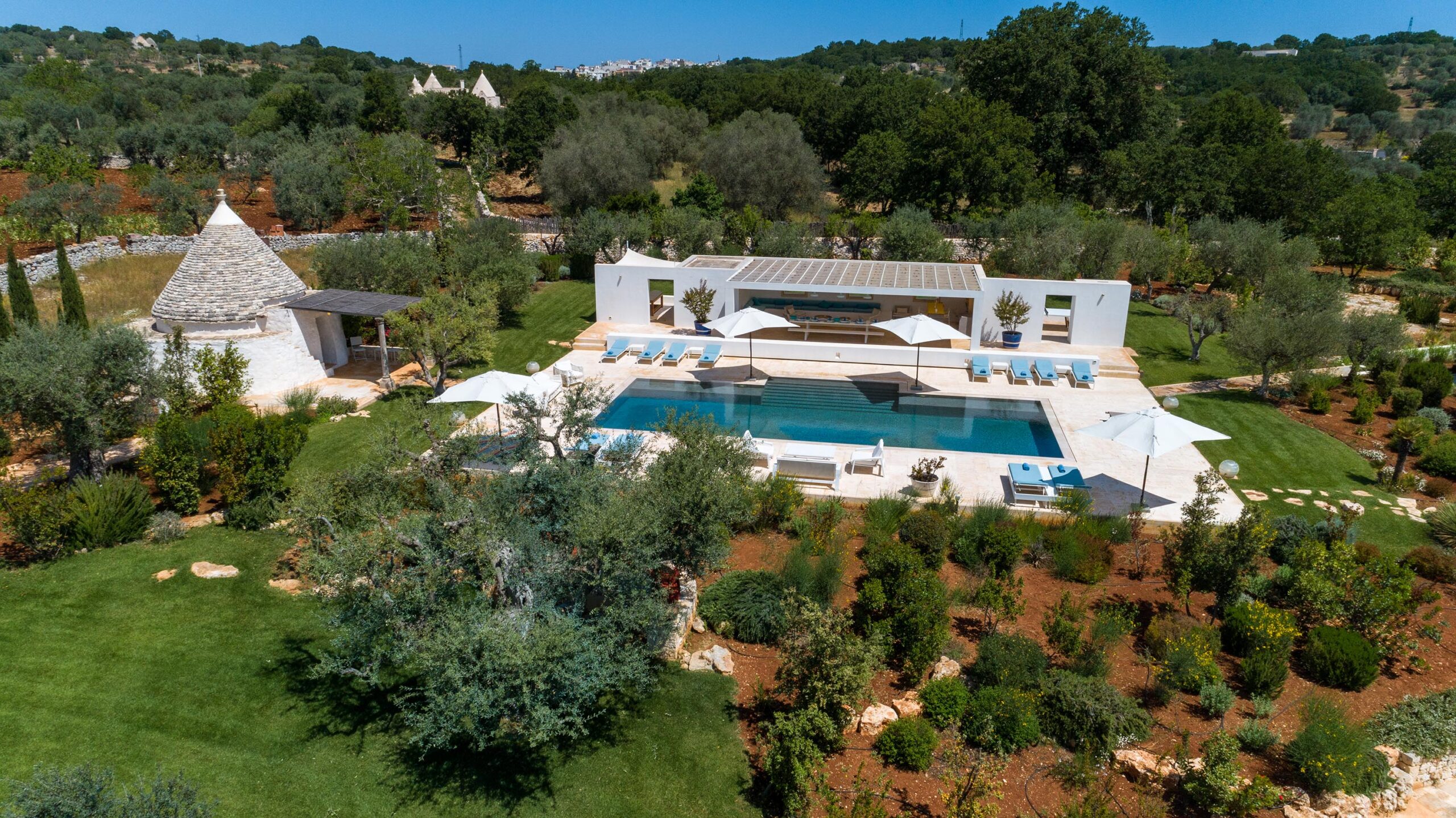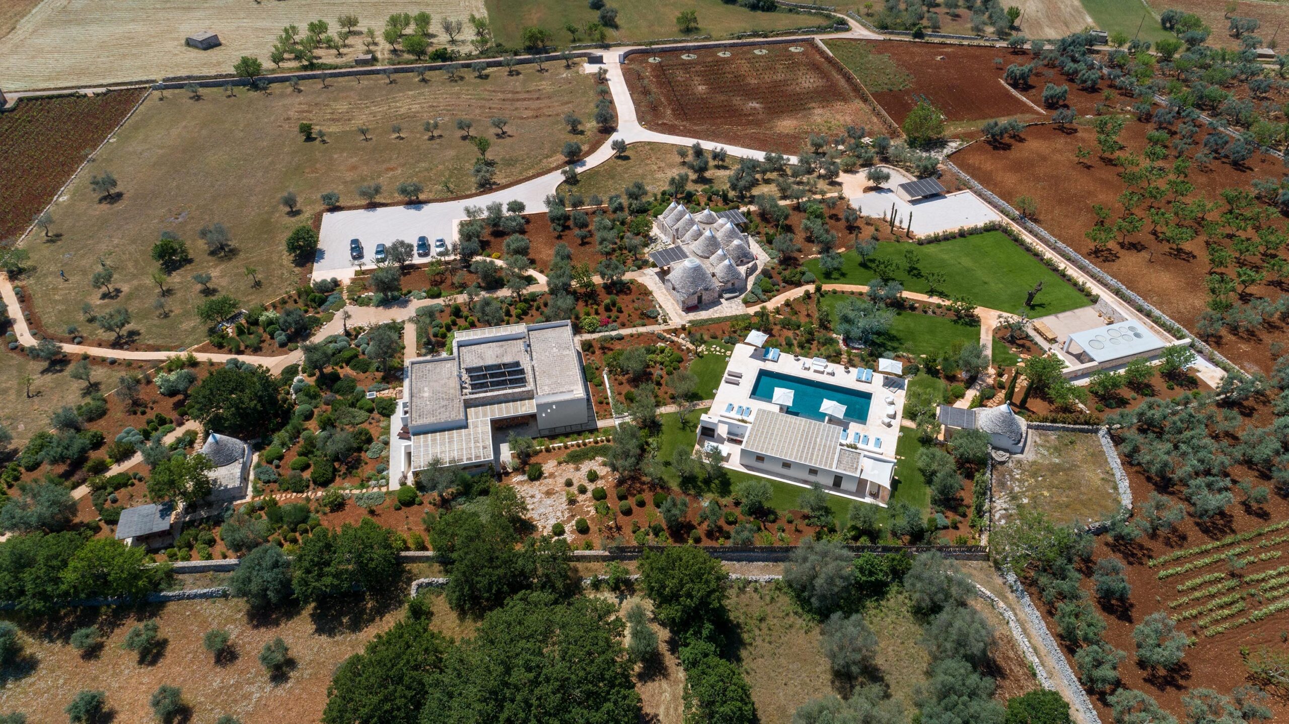 Le Ali Bianche is a countryside residence located in the Valle d’Itria, between the centers of Ostuni and Cisternino. The property is composed of a main contemporary dwelling and an extensive complex of twelve traditional renovated trulli, offering a balanced spatial atmosphere for up to sixteen guests. Positioned within a sixty-thousand-square-meter estate featuring olive groves and vineyards, the residence provides high levels of privacy and panoramic views across the valley. The estate’s concept is defined by the integration of historic circular stone vaults with modern designer interiors and specialized professional facilities.