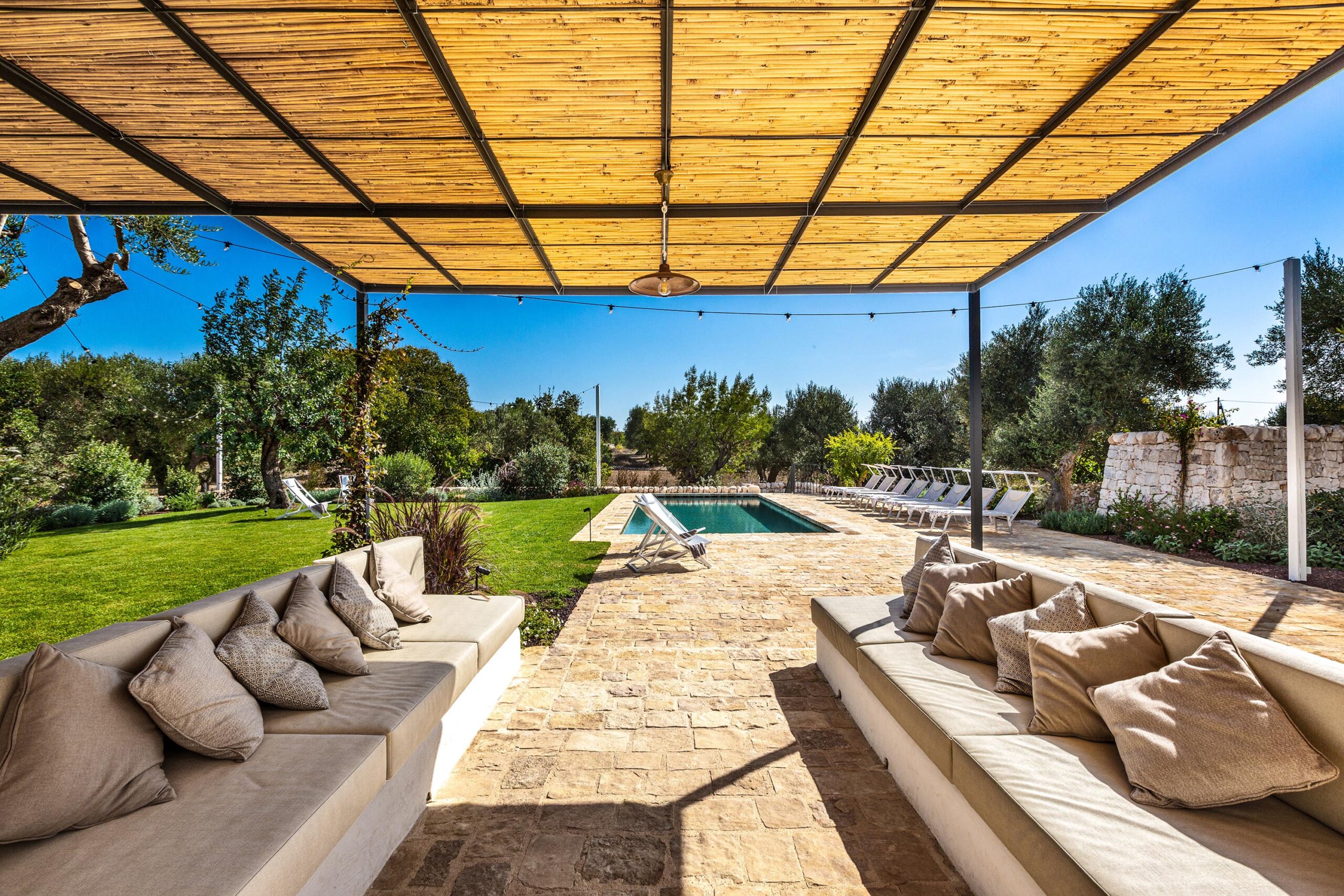 The outdoor spaces extend over a one-hectare private estate, primarily occupied by an ancient olive grove and a green lawn. The exterior includes a fifty-square-meter equipped zone and a covered veranda that overlooks the swimming pool. A dedicated solarium area, furnished with sunbeds, is positioned within the grounds to facilitate outdoor relaxation. The property features a barbecue explicitly integrated into the garden layout for external culinary use. The estate is accessed via remote-controlled gates and is fully fenced to ensure the security of the sit