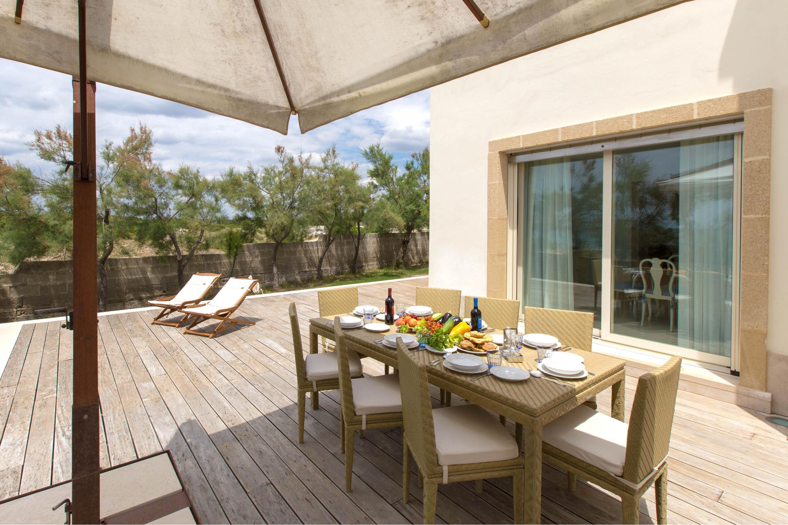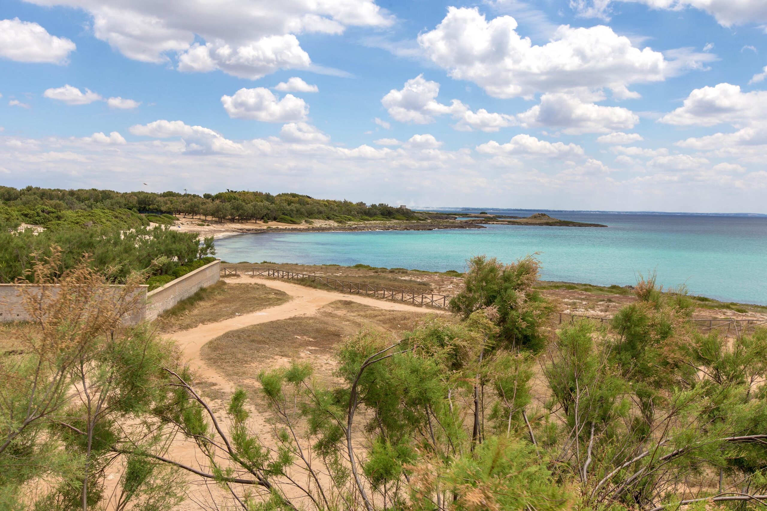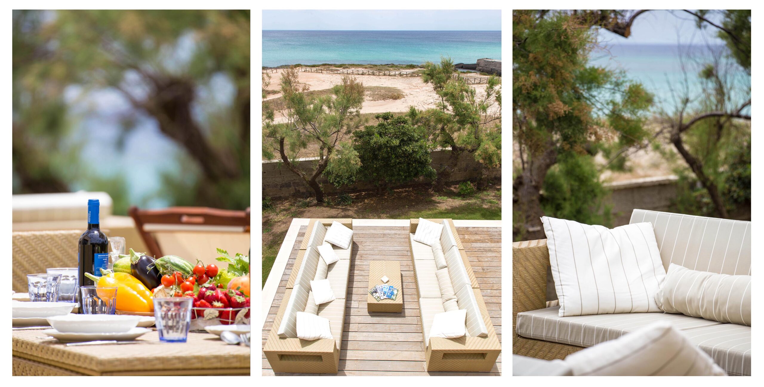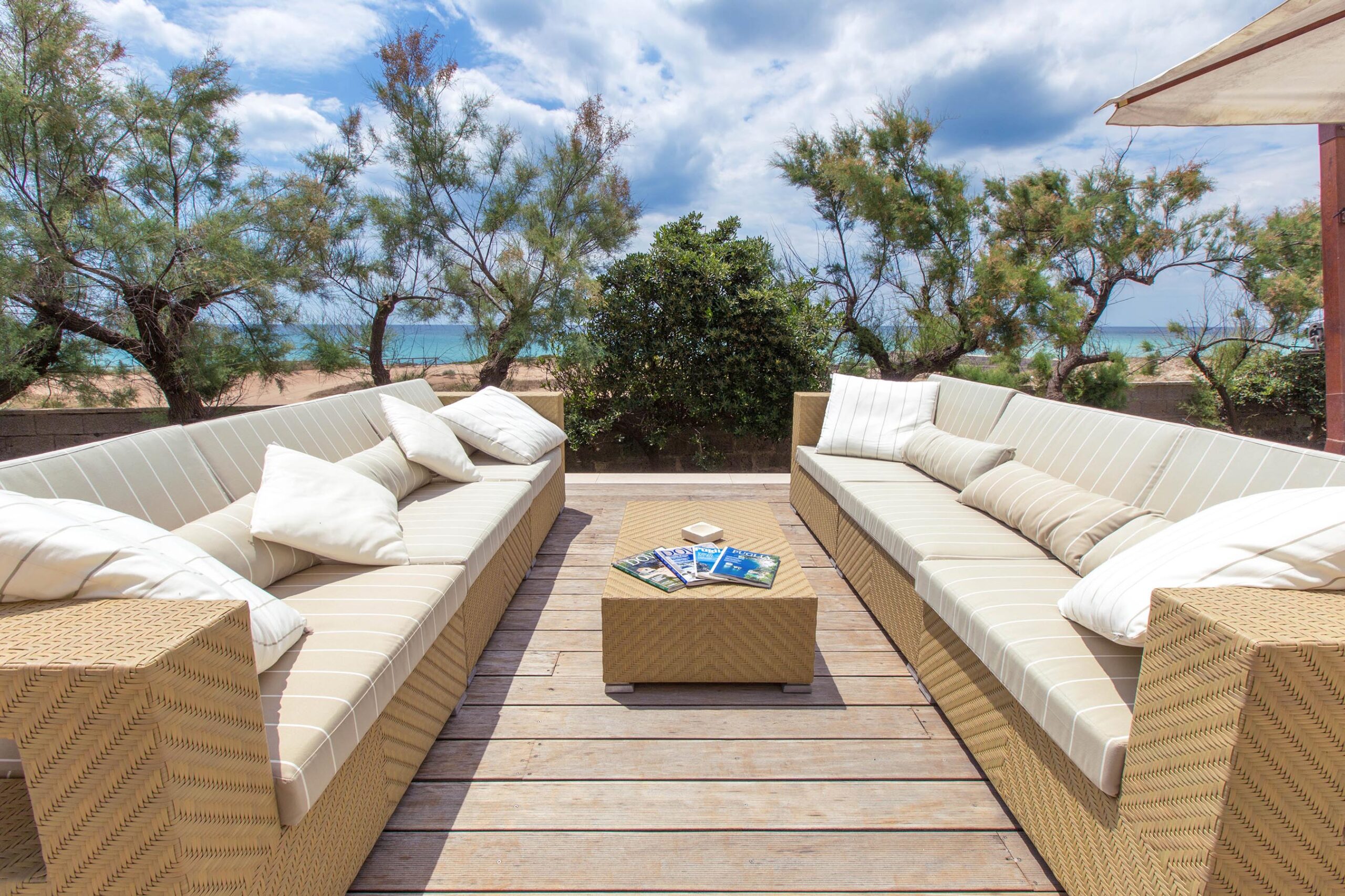 The residence is located directly on the beach of Torre Castiglione in the Porto Cesareo territory, providing immediate access to both sandy stretches and the coastal reef.
