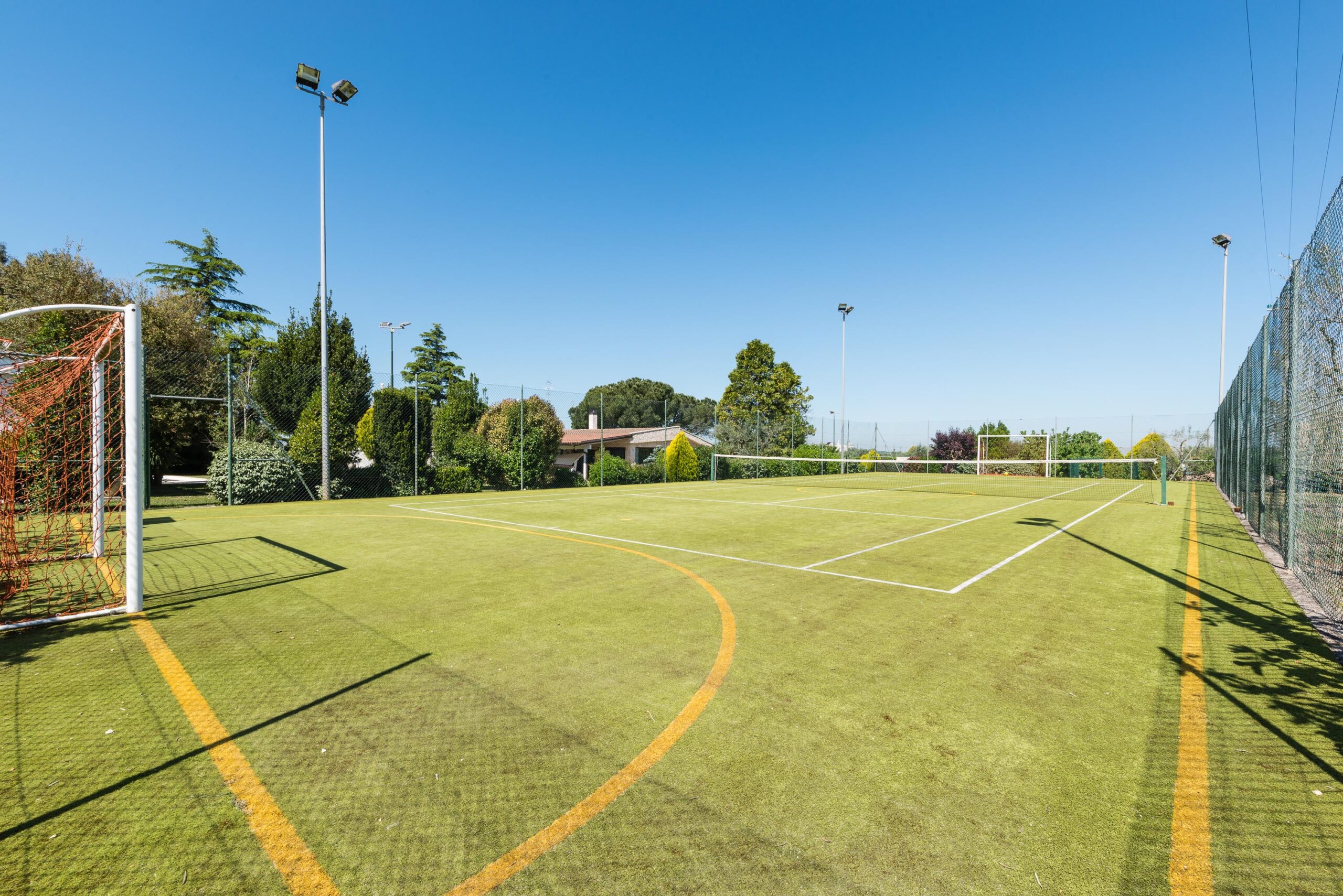 The outdoor spaces span 5,000 square meters of land, including a 75-square-meter swimming pool operational from May 1st to October 31st. The grounds feature an 800-square-meter garden and a 200-square-meter park area, housing a tennis court, a soccer field, and a basketball hoop. A specialized spa building is located near the pool, containing a sauna, a whirlpool shower, and a five-person whirlpool with views of the garden. The exterior layout is further supported by a 100-square-meter equipped zone, a pergola for dining, and an outdoor shower. A dedicated barbecue area is positioned near the pergola overlooking the trulli.