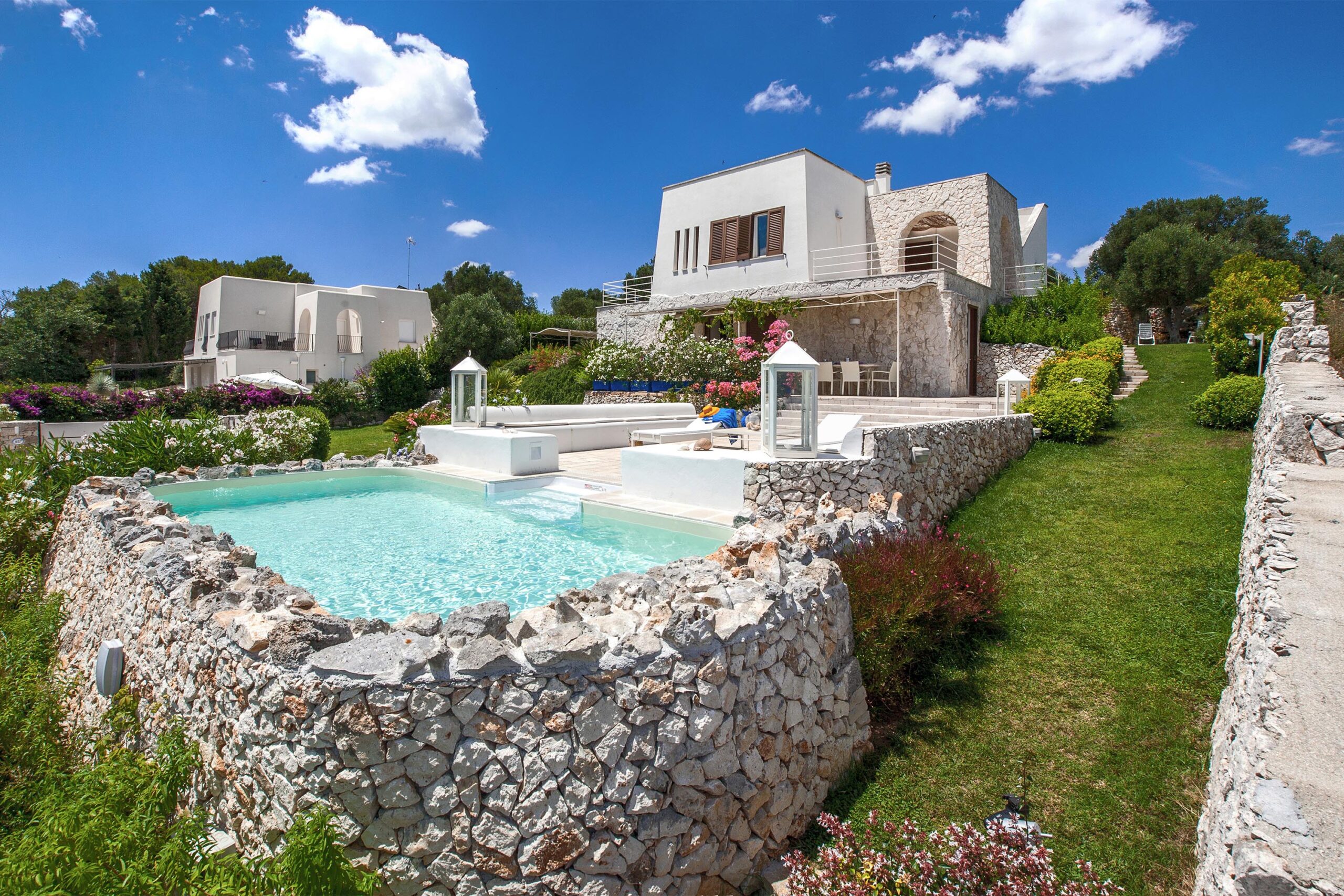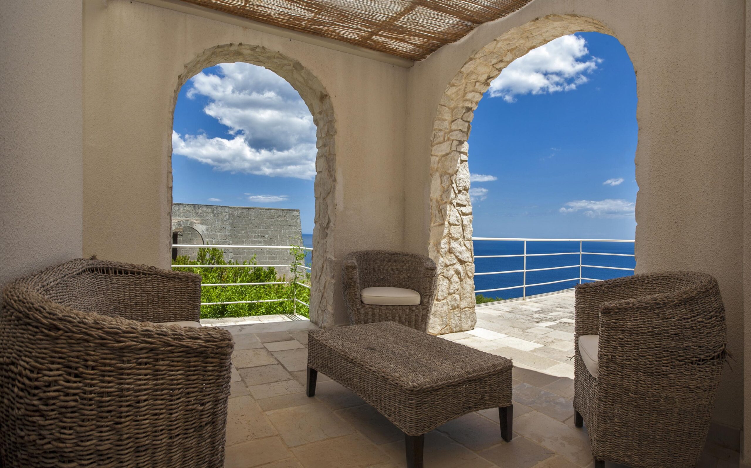 Villa Fanò is a residential property situated on a promontory overlooking the Adriatic coast between Castro and Santa Cesarea Terme. The architectural identity is defined by a two-story structure that integrates Mediterranean design elements with a seafront positioning on a panoramic hill. The estate accommodates up to eight guests within a spatial atmosphere focused on coastal orientation and functional living. Positioned one kilometer from the sea, the residence maintains a coherent relationship with the surrounding promontory landscape and the nearby Zinzulusa and Romanelli caves.