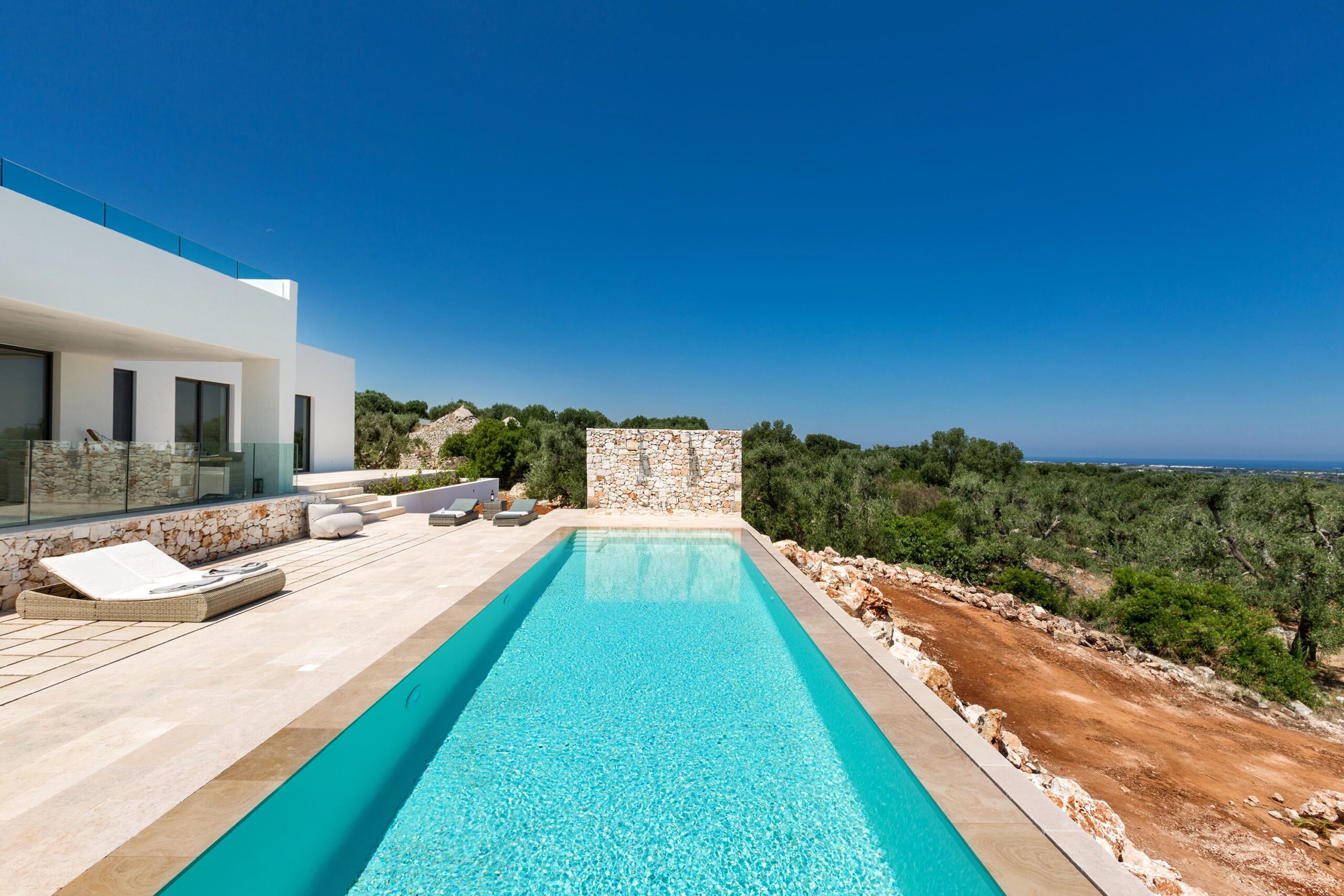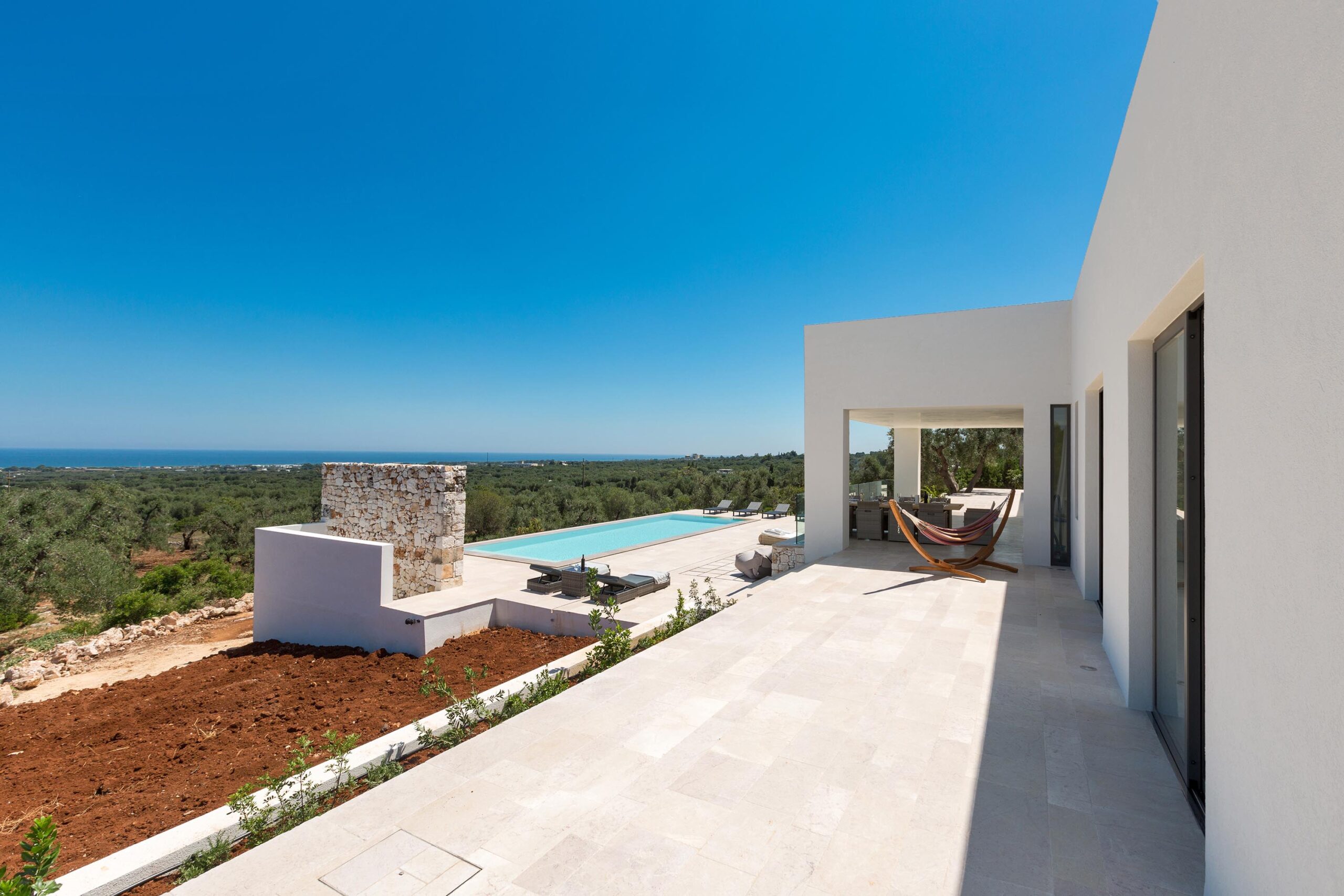 The villa is located in the countryside of Carovigno, a geographic setting characterized by olive groves and its proximity to the Torre Guaceto protected marine area.