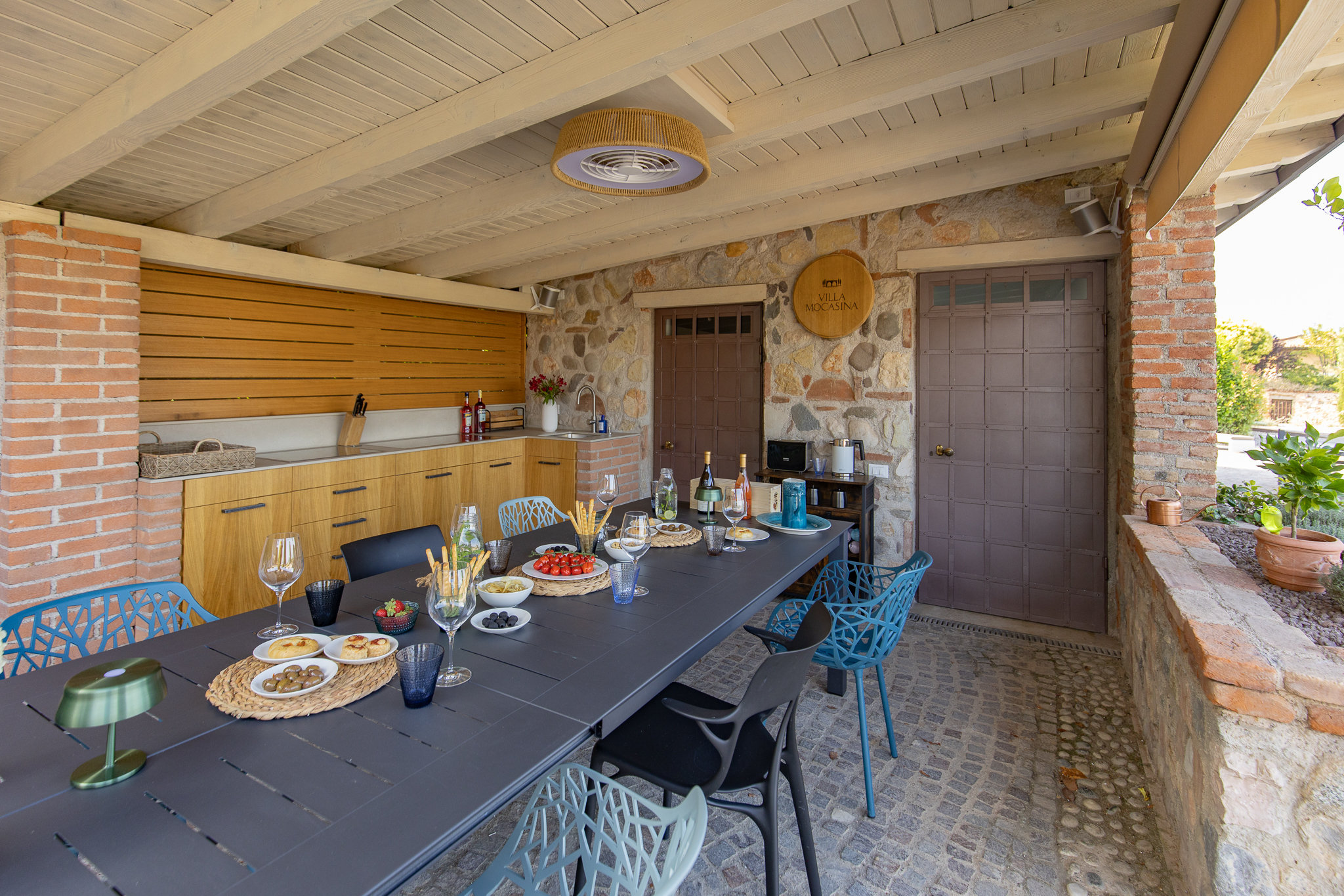 The property is organised across a main villa and an independent pool house conceived as a self-contained unit. The main residence accommodates three double bedrooms, each with en-suite bathroom, including configurations with additional beds and varied bathroom features such as rain showers and a bathtub with integrated shower. The pool house offers a fourth double bedroom with additional sleeping capacity and en-suite facilities, as well as its own kitchen area. Two additional guest bathrooms complete the internal distribution. Living spaces include a combined lounge and dining area with home cinema, a library, and a vaulted cellar adapted as a fitness room. The architectural identity is defined by preserved historical elements such as vaulted ceilings and stone structures, combined with contemporary interventions. The culinary infrastructure is a defining feature, with multiple fully equipped kitchens distributed across the estate, including dedicated indoor and outdoor preparation areas.