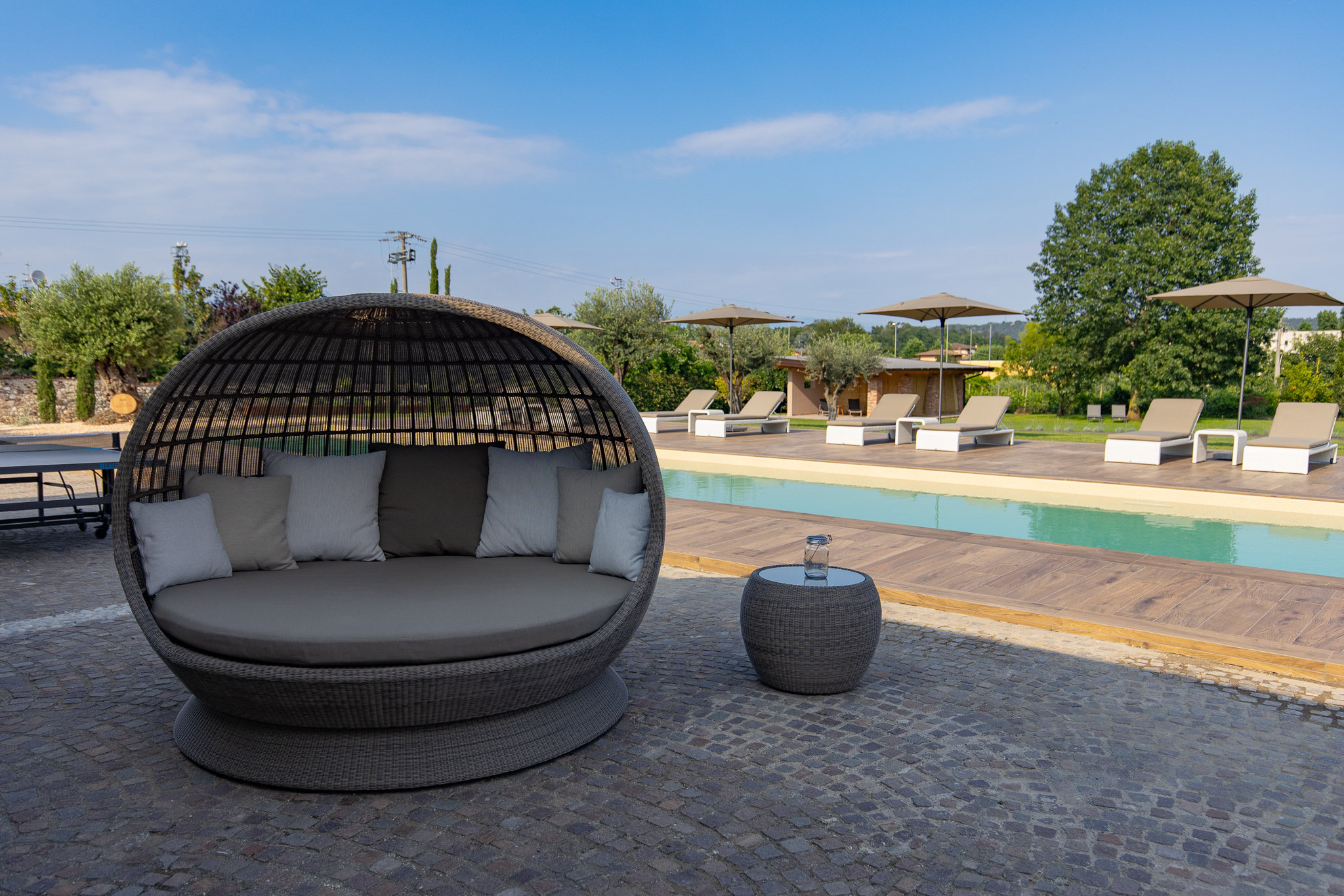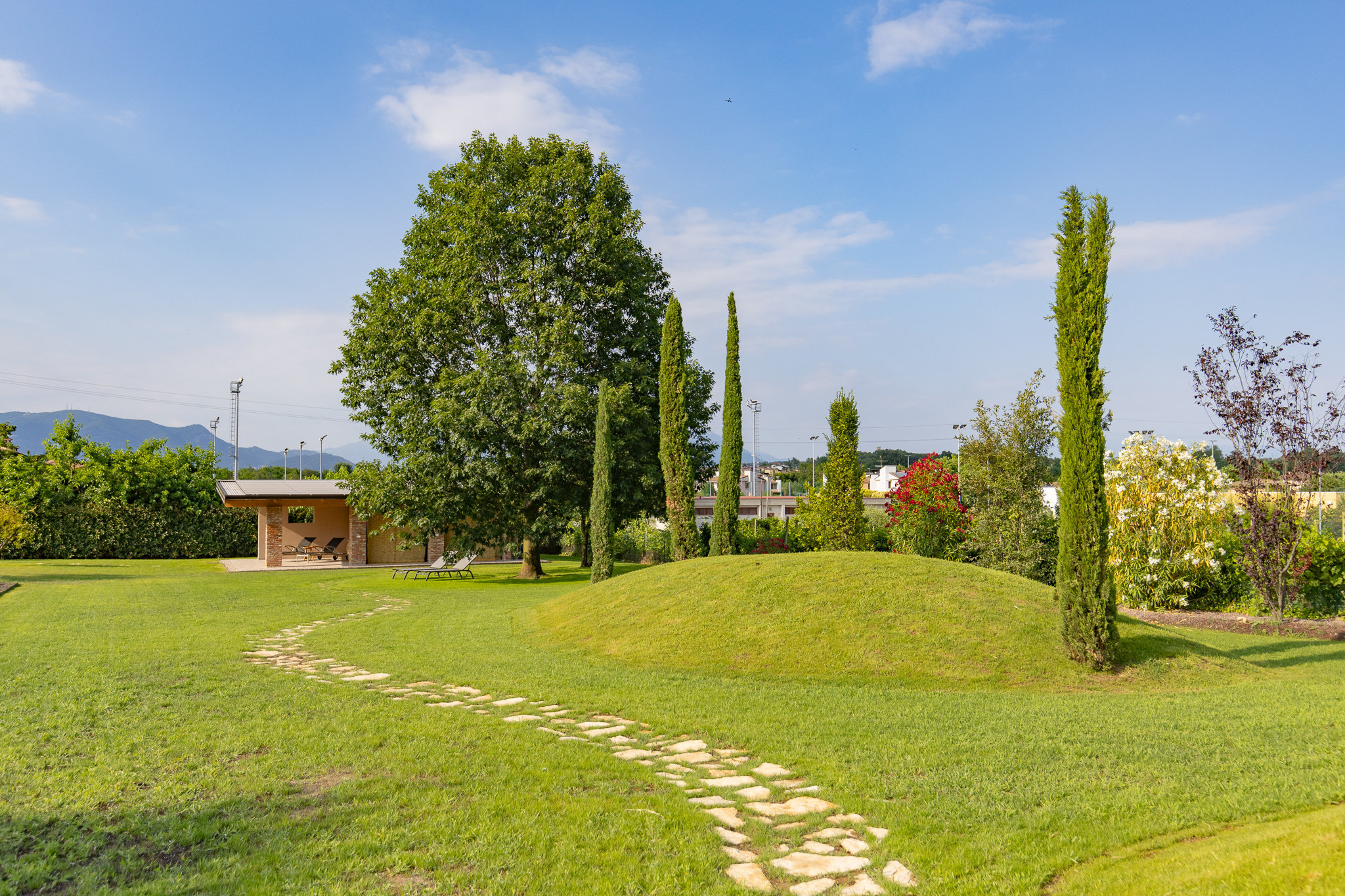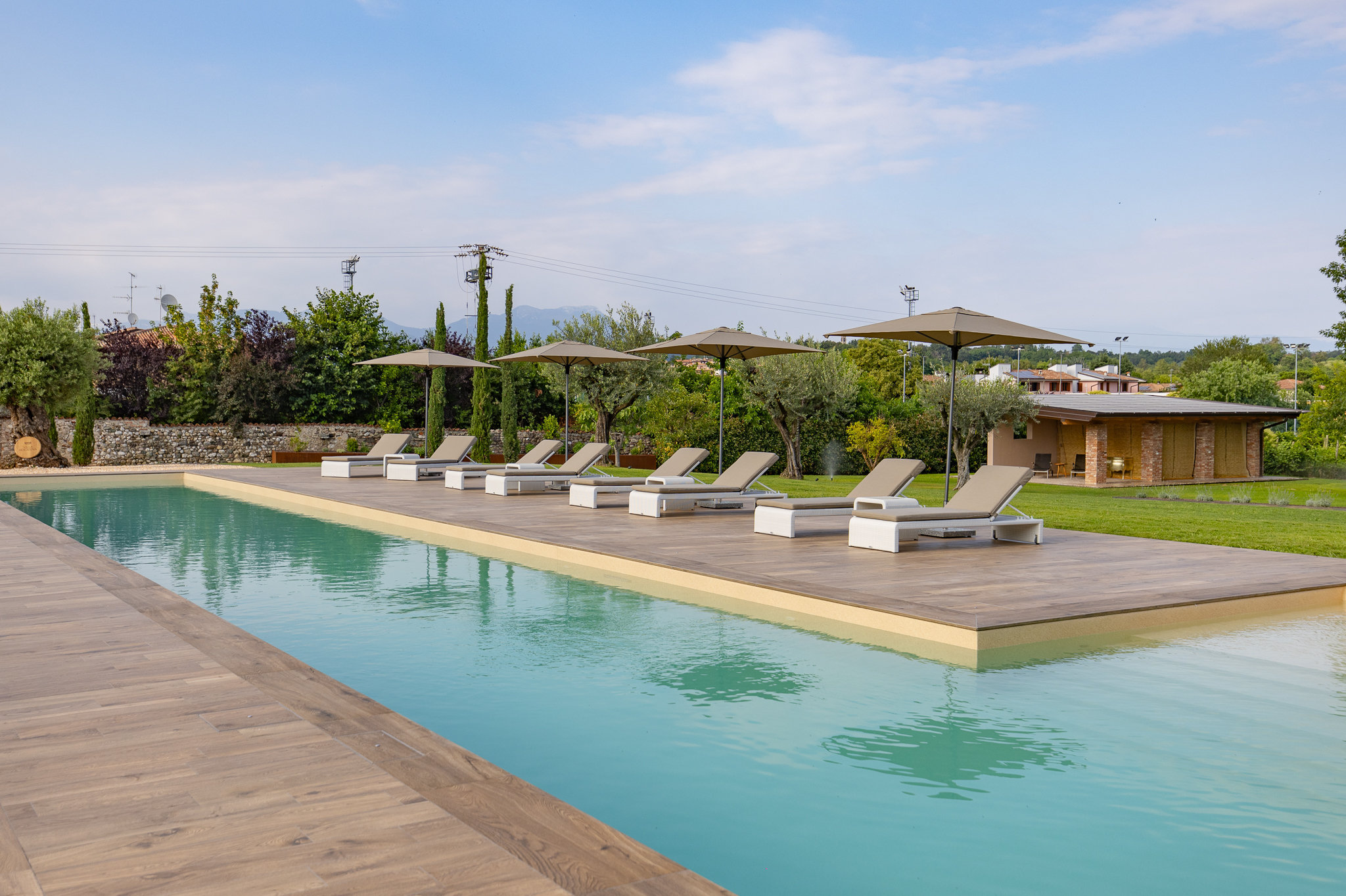 The outdoor areas extend across approximately 5,000 m² of landscaped grounds, fully enclosed and structured to support both leisure and functional use. The central feature is a 25 x 4 metre private swimming pool with an additional chill-out section, maintained at controlled temperature and operational from Easter through early November. The pool area is equipped with sun loungers, parasols, and a lounge space arranged for extended use. The garden integrates olive trees, fruit cultivation areas, and defined zones for recreational activities, including a putting green and open-air sports spaces. A covered outdoor kitchen and dining area establish continuity between interior and exterior living, supporting the property’s culinary positioning. The overall landscape composition reflects a balance between cultivated garden design and the surrounding rural context of vineyards and rolling terrain.
